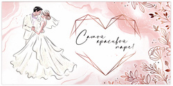Конверт с тематическим свадебным принтом и надписью "САМОЙ КРАСИВОЙ ПАРЕ!" изготовлен из высококачественного картона плотностью 215 г/м2. Отделка - блестки. Размер – 166х82 мм.
