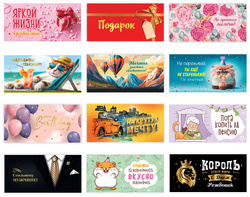В состав набора входят 12 конвертов разных цветов и дизайнов. Благодаря разнообразию дизайнов вы сможете выбрать подходящий вариант для любого случая. Каждый конверт изготовлен из высококачественного картона плотностью 215 г/м2. Отделка - глянцевая ламинация. Размер - 166х82 мм.