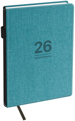 Ежедневник датированный на 2026 год BG серии "Fillsta" – идеальный компаньон для стильной и организованной жизни. Твёрдая обложка изготовлена из бирюзовой экокожи, стилизованной под ткань. Мотивирующая фраза, нанесённая с помощью тиснения, добавит позитивных эмоций.