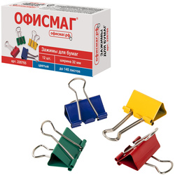 Изготовлены из стали с цветным покрытием. Позволяют скреплять до 140 листов. Не деформируют бумагу. Ширина зажима - 32 мм. Поставляются по 12 штук в картонной коробке.