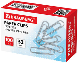 Скрепки никелированные BRAUBERG, 33 мм, 100 шт/уп