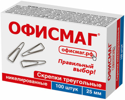 Скрепки никелированные ОФИСМАГ, 25 мм, треугольные, 100 шт/уп