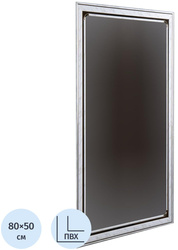 Зеркальное полотно влагостойкое, экологически чистое. Толщиной 4 мм. Размер 500×800 мм с обработанной и полированной кромкой. Зеркало обрамлено влагостойкой двойной рамкой из ПВХ, цвет — белый. Ширина рамы — 41 мм. Упаковано в целлофан, в коробку из трехслойного ударостойкого гофрокартона марки Т24. По периметру проложен пенопласт толщиной 10 мм. Крепежи к стене — скрытые пластины, позволяющие вешать зеркало как вертикально, так и горизонтально. К ним в комплекте дюбель-костыль.