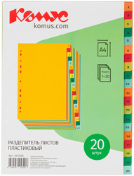 Разделители листов пластиковые КОМУС, А4, 20 листов, цифровой 1-20, цветной