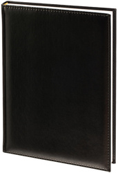 Ежедневник датированный на 2026 год. Формат: 200×270 мм. Цвет: черный. Блок 352 страницы (176 листов) в 2 краски. Бумага офсетная 70 г/кв.м. Блок с перфорацией уголка. Алфавитный блок без вырубки. Дополнительный блок со справочной информацией включает: календарь на 2026-2029 года, планирование на год, справочная информация, карта часовых поясов, лучшие места отдыха в зависимости от времени года, международные размеры одежды и обуви, символы по уходу за одеждой, знаки зодиака, питание и расход калорий. Закладка-ляссе. Твердая обложка с прошивкой по периметру выполнена из искусственной кожи высокого качества. Возможно нанесение логотипа на обложку, любым способом тиснения (блинт или фольга).