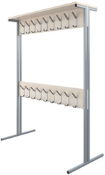 Вешалка двухсторонняя Комус Мебель напольная. Каркас вешалки выполнен из металлического профиля 25×25 мм с толщиной стенок не менее 1,2 мм. Покрыт порошковой краской, стойкой к химическим и механическим воздействиям. Панели с крючками и полка для головных уборов выполнены из ЛДСП толщиной 16 мм, торцы деталей закрыты противоударной кромкой ПВХ. Вешалка оснащена 36 металлическими крючками (по 18 крючков с каждой стороны). Крючки крепятся к панелям на межсекционные стяжки.