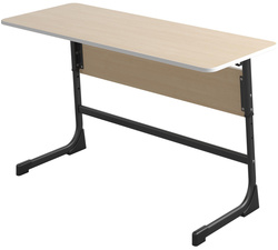 Парта растущая двухместная Комус Мебель. Столешница и фронтальная панель стола выполнены из ЛДСП толщиной 16 мм. Торцы столешницы закрыты противоударной кромкой ПВХ толщиной 2 мм. Торцы фронтальной панели закрыты противоударной кромкой ПВХ толщиной 0,5 мм. Опоры стола имеют L — образную форму и выполнены из плоскоовального металлического профиля 45×25 мм и 20×40 мм с толщиной стенок не менее 1,5 мм. Опоры имеют телескопический механизм регулировки высоты с пластиковой переходной втулкой. В зависимости от модели стола регулировка осуществляется в диапазоне с 3 по 5 или с 5 по 7 ростовые группы. Столешница к опорам крепится на О-образную металлическую раму из профиля квадратного сечения 25×25 мм с толщиной стенок не менее 1,2 мм, обеспечивающая столу дополнительную жёсткость и надёжность. Для придания дополнительной жёсткости между опорами в нижней части стола установлена металлическая траверса из плоскоовального профиля 20×40 мм. Каркас покрыт порошковой краской, стойкой к химическим и механическим воздействиям и имеет полимерные подпятники, предотвращающие повреждение напольного покрытия. Столешница крепится к раме на 4 винта посредством установленных в столешницу футурок, на лицевой стороне столешницы видимый крепёж отсутствует. Фронтальная панель крепится к каркасу на мебельные болты с гайками. Регулировка высоты стола осуществляется с помощью винтовых соединений с гайкой Эриксона. В конструкции предусмотрено 2 крючка для портфелей. Стол имеет цветовую маркировку в соответствии с ростовой группой. Стол изготавливается в соответствии с ГОСТ 11015-93.