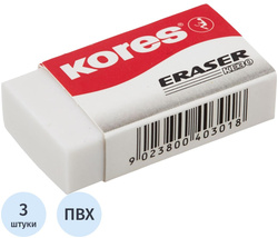 Ластик KORES, 40x21x10 мм, 3 шт/уп, ПВХ, белый