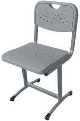Стул ученический Универсал. Сиденье и спинка изготовлены из пластика толщиной не менее 38 мм. Металлический каркас разборный и выполнен из профиля круглого сечения диаметром 25 мм с толщиной стенки не менее 1,5 мм и плоскоовального профиля 40×20 мм и 45×25 мм с толщиной стенки не менее 1,5 мм, покрыт порошковой краской, стойкой к химическим и механическим воздействиям. На свободных концах труб установлены заглушки из ударопрочных полимеров. Каркас стула имеет полимерные подпятники, предотвращающие повреждение напольного покрытия. Сиденье и спинка крепятся к основанию при помощи мебельных болтов и гаек. Стойка стула имеет наклон вперёд 5 градусов. Механизм регулировки высоты телескопический. Регулировка высоты осуществляется с помощью винтовых соединений с гайкой Эриксона. Нижняя опора стула имеет изогнутую форму с двумя точками изгиба. Стул имеет цветовую маркировку в соответствии с ростовой группой. Стул изготавливается в соответствии с ГОСТ 11016-93.