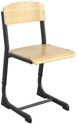 Стул ученический Комус Мебель. Сиденье и спинка изготовлены из гнутоклеенной фанеры толщиной не менее 8 мм, покрыты бесцветным лаком. Каркас стула выполнен из плоскоовального металлического профиля 45×25 мм, 40×20 мм и 30×15 мм с толщиной стенок не менее 1,5 мм. Опоры стула L-образной формы имеют телескопический механизм регулировки высоты с пластиковой переходной втулкой. Каркас стула покрыт порошковой краской, стойкой к химическим и механическим воздействиям. На свободных концах труб установлены заглушки из ударопрочных полимеров. Каркас стула имеет полимерные подпятники, предотвращающие повреждение напольного покрытия. Сиденье и спинка крепятся к основанию при помощи мебельных болтов. Для дополнительной жёсткости в нижней части стула между опорами установлена съёмная металлическая траверса. Стул изготавливается в соответствии с ГОСТ 11016-93 и имеет цветовую маркировку в соответствии с ростовой группой.