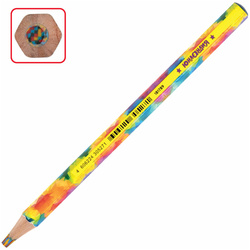 Необычный грифель карандаша сочетает в себе четыре цвета - желтый, красный, голубой, зелёный. Утолщенный шестигранный корпус позволяет не скатываться карандашу с поверхности стола во время занятий рисованием и комфортно располагается в руке ребенка. Карандаш изготовлен из высококачественной древесины. Корпус покрыт цветной печатью. Мягкий грифель диаметром 5 мм из натуральных материалов и пигментов обладает повышенной прочностью. Карандаши упакованы в пластиковую прозрачную тубу с красочным стикером.