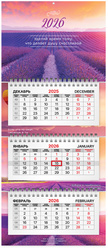 Офисный календарь на 2026 год на 3 гребнях. Для удобства планирования состоит из 3 блоков с календарными сетками на три месяца – предыдущий, текущий и следующий. Курсор-бегунок выделяет текущую дату.
