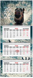 Офисный календарь на 2026 год на 3 гребнях. Для удобства планирования состоит из 3 блоков с календарными сетками на три месяца – предыдущий, текущий и следующий. Курсор-бегунок выделяет текущую дату.