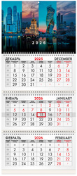 Офисный календарь на 2026 год на 3 гребнях. Для удобства планирования состоит из 3 блоков с календарными сетками на три месяца – предыдущий, текущий и следующий.