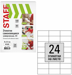 Этикетки универсальные STAFF, 70х37,1 мм, 25 шт на листе, белые, 100 листов, 80 г/м2