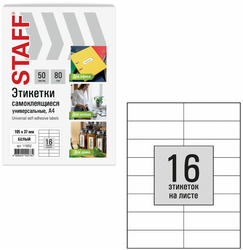 Этикетки универсальные STAFF BASIC, 105х37 мм, 16 шт на листе, белые, 50 листов, 80 г/м2