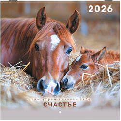 Календарь настенный перекидной на скрепке BRAUBERG МИНИ на 2026 год, Благородные лошади, 12 листов, 214х214 мм