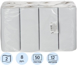 Двухслойные бумажные полотенца, белого цвета. Изготовлены из вторичного, экологически чистого переработанного волокна. Незаменимый помощник на кухне. Хорошо осушает руки и поверхности. В рулоне 50 отрывных листов размером 22×24 см.