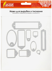 В набор входит 10 стальных ножей в форме фигурных бирок, с максимальным размером 110х113 мм. Ножи многофункциональны: каждый из них позволяет создать вырубку и эффект тиснения. Материалы, подходящие для работы – бумага, картон, алюминиевая фольга для рукоделия, фоамиран и другие.